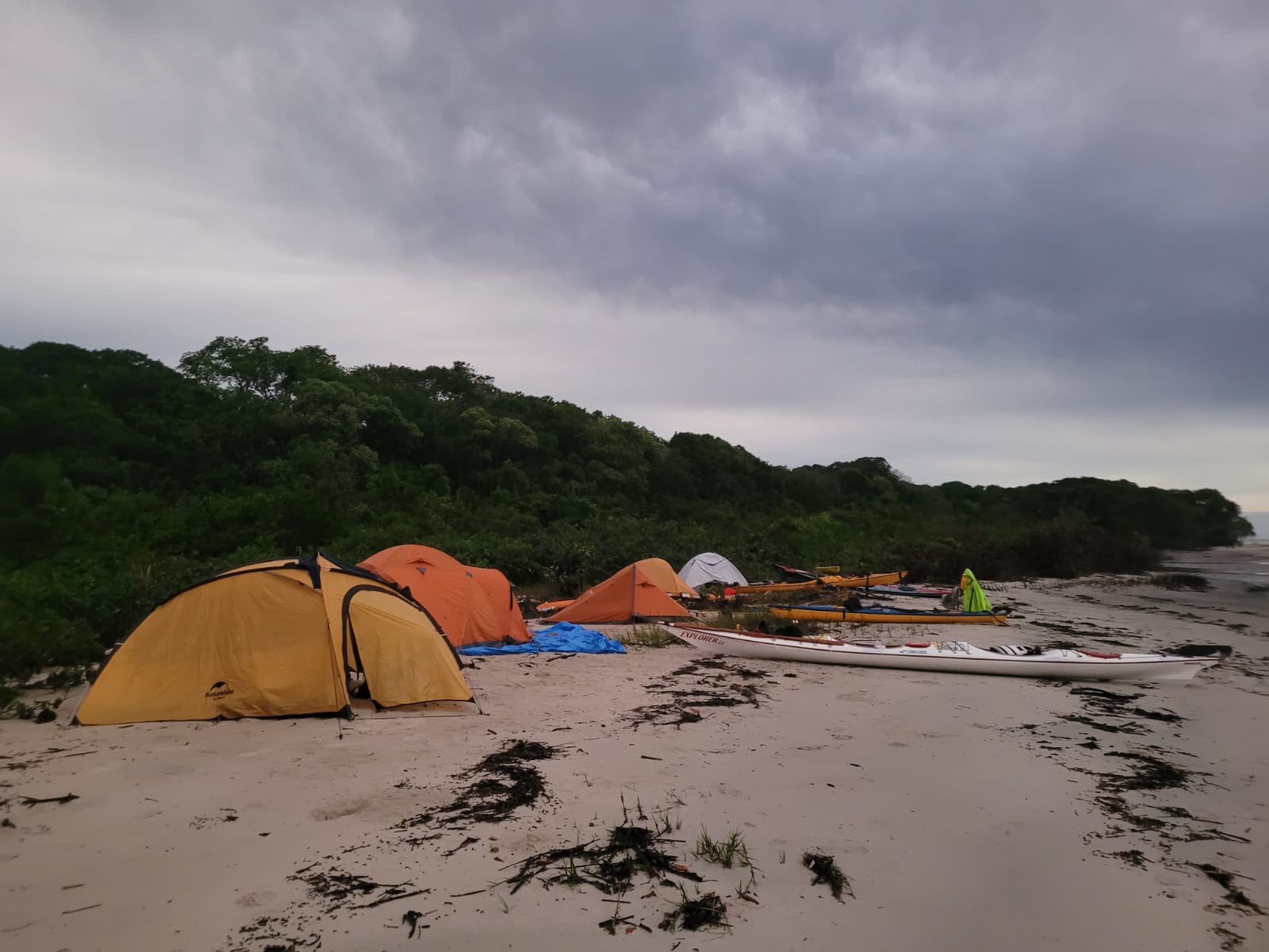 Fomos remando para dentro da baía até encontrar um lugar com uma quantidade maior de areia bem branca, sinal de que a maré não chegara ali nos últimos dias. Além disso, conversamos com um pescador que disse que ela não subiria muito na próxima noite. Acabamos acampando mais para dentro da ilha. Fomos agraciados com um belo final de tarde.